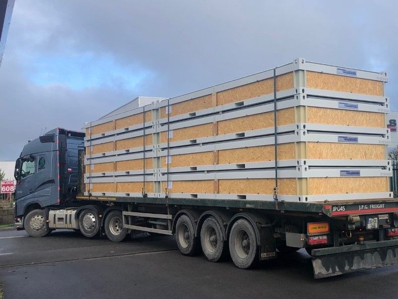 Для дальних перевозок используется технология Trans-Pack: пол, крыша и стеновые панели складываются в компактный транспортный пакет (при разборном каркасе). Один грузовик перевозит до восьми модулей — до 120 м² площади на одной платформе. Это снижает транспортные расходы и делает модульные решения доступными в любом регионе.