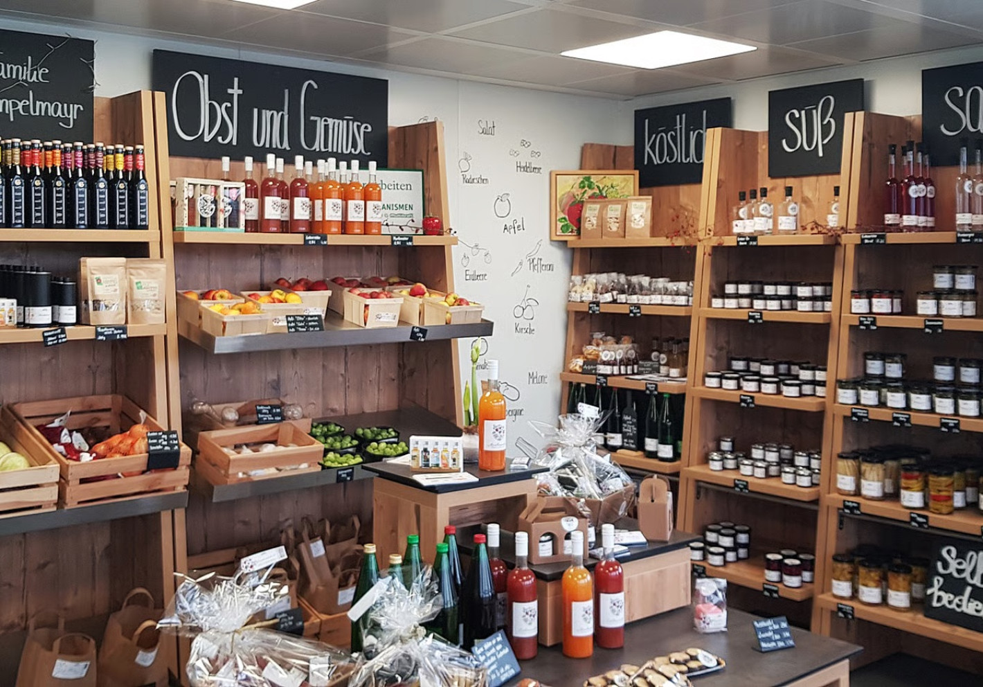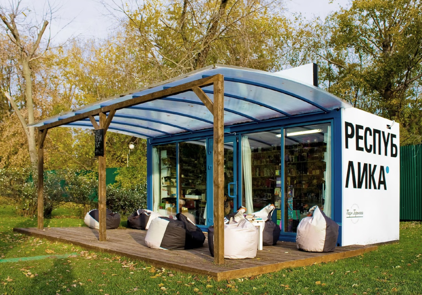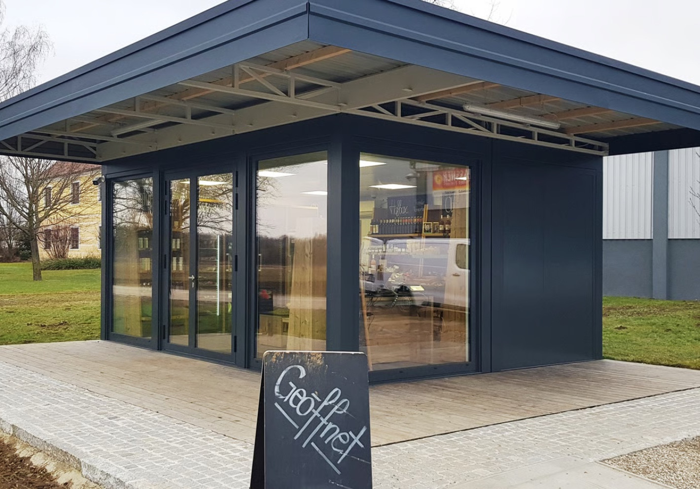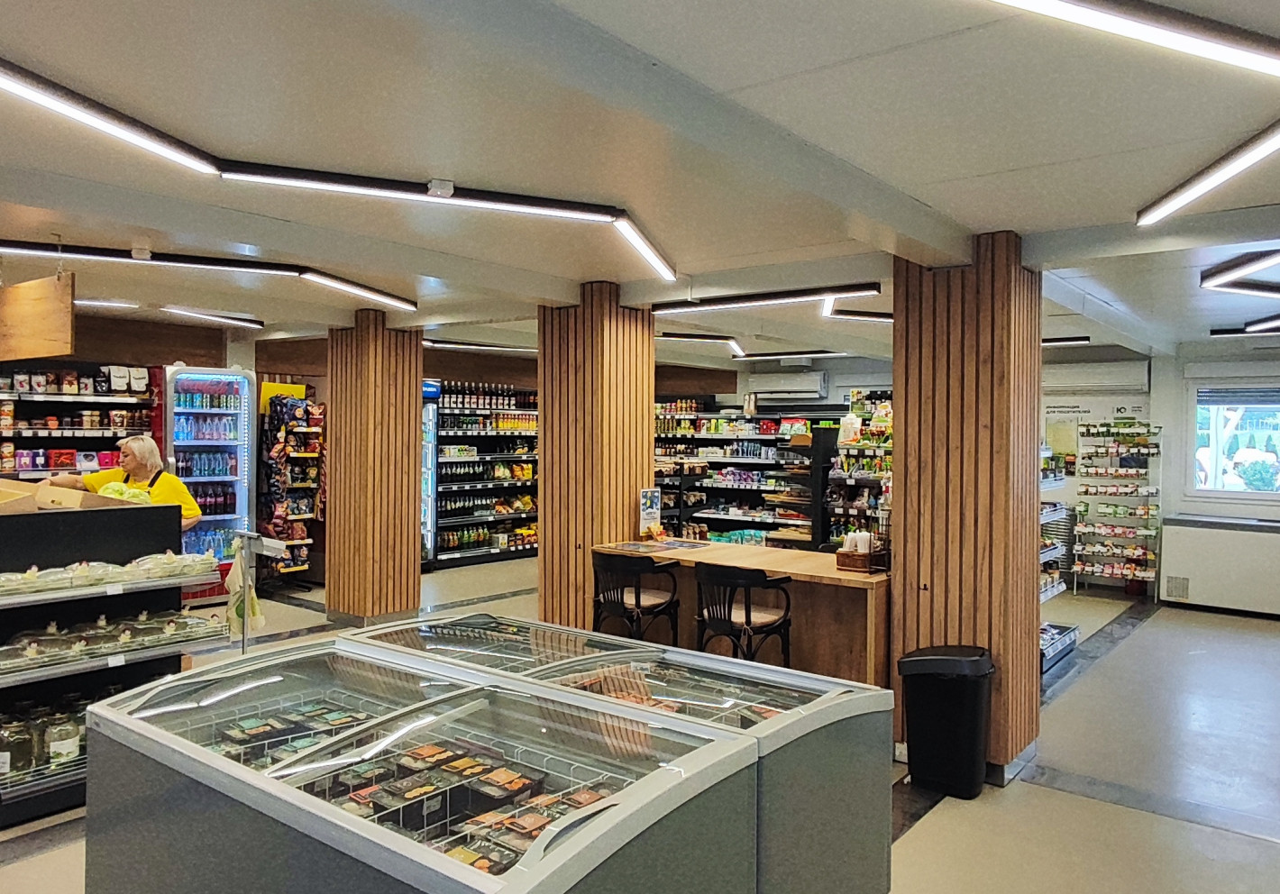 Продуктовый магазин на территории эко-парка с помещением для сотрудников и торговым залом.