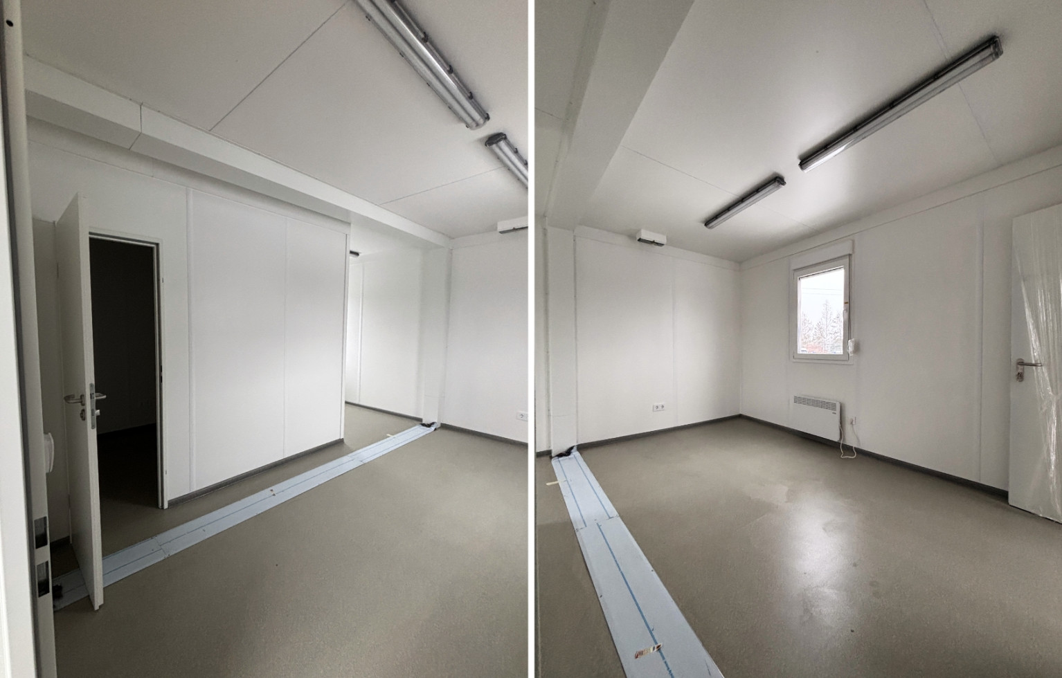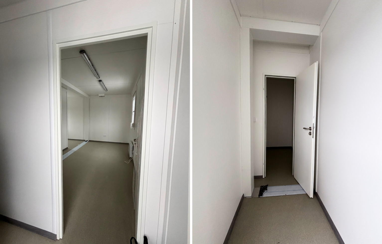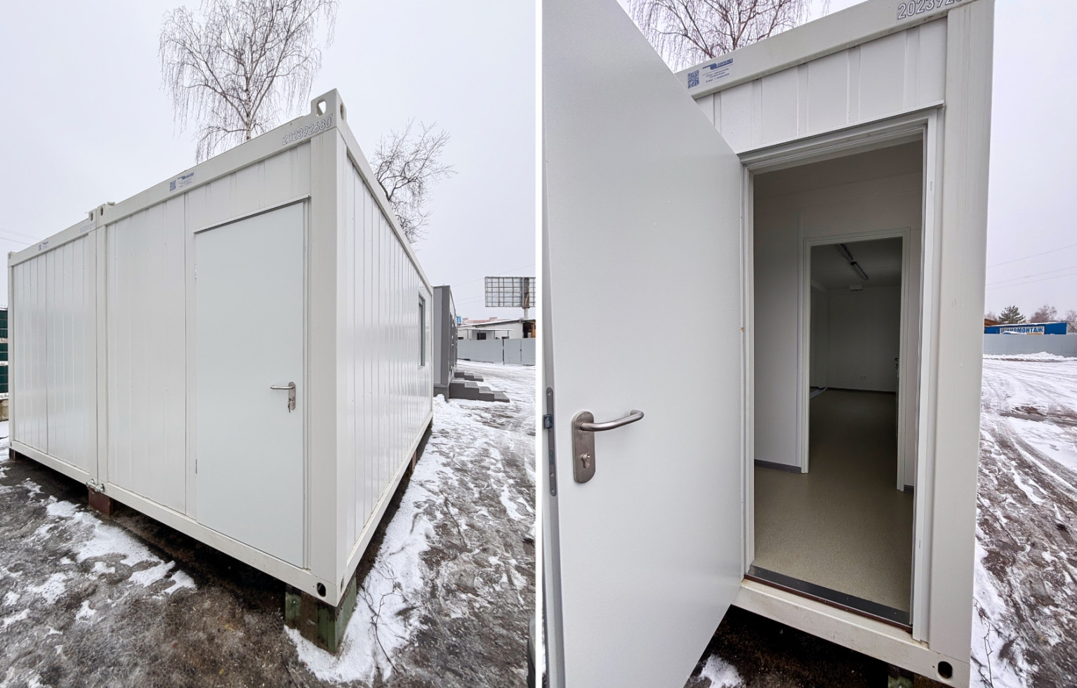 Сдвоенный модуль на территории предприятия включающий офисную и кухонную зону, а также помещение для санузла.