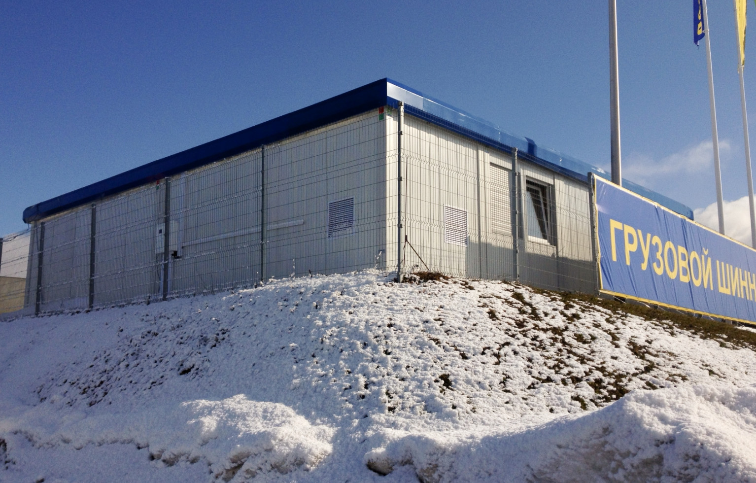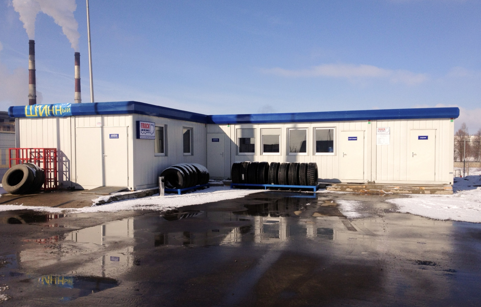Шинный центр для грузовых автомобилей из восьми блок-контейнеров с декоративной аттикой.