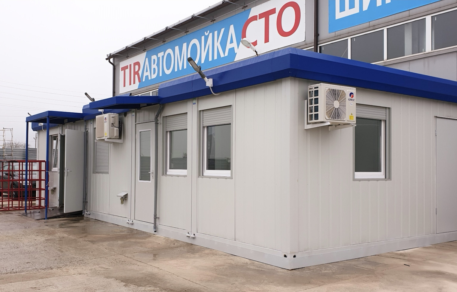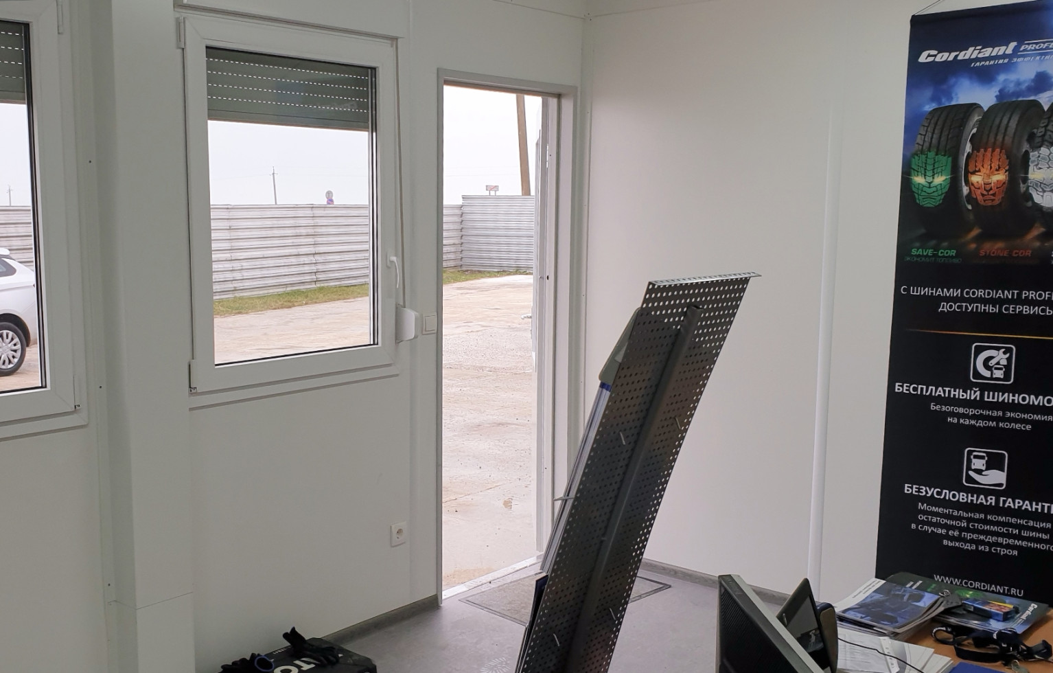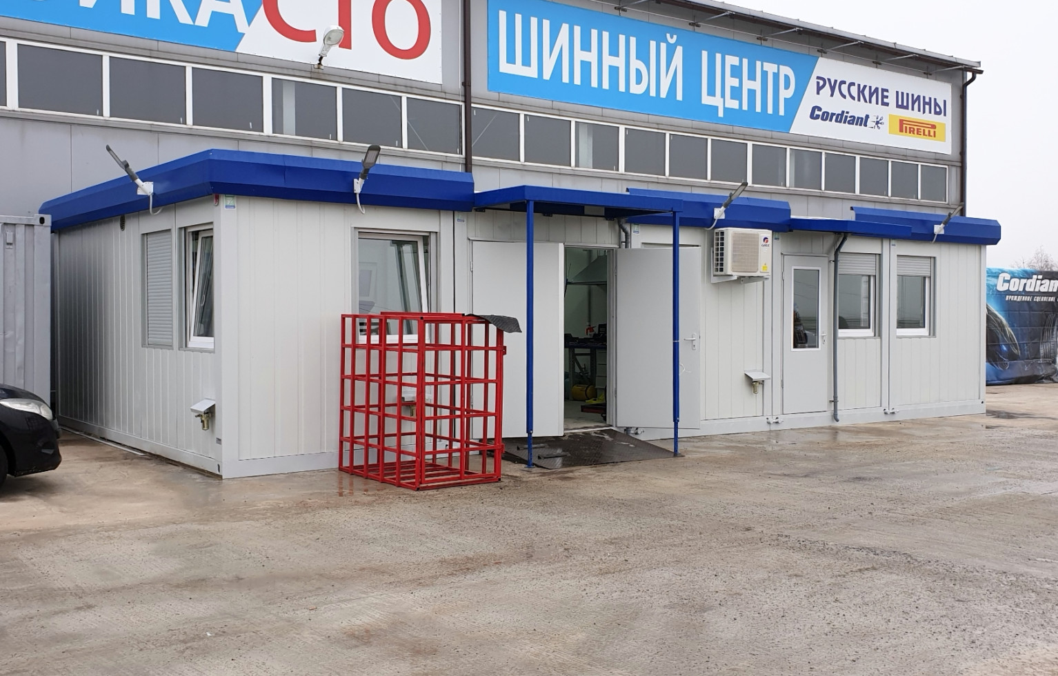 Шинный центр для обслуживания грузовых автомобилей, выполненный из пяти блок-контейнеров с устройством монолитного пола в ремонтной зоне.