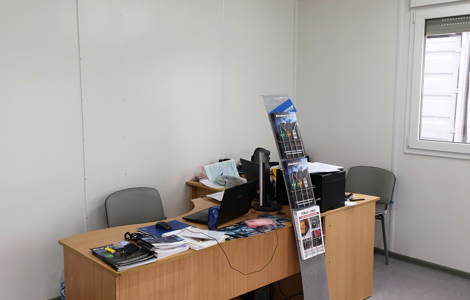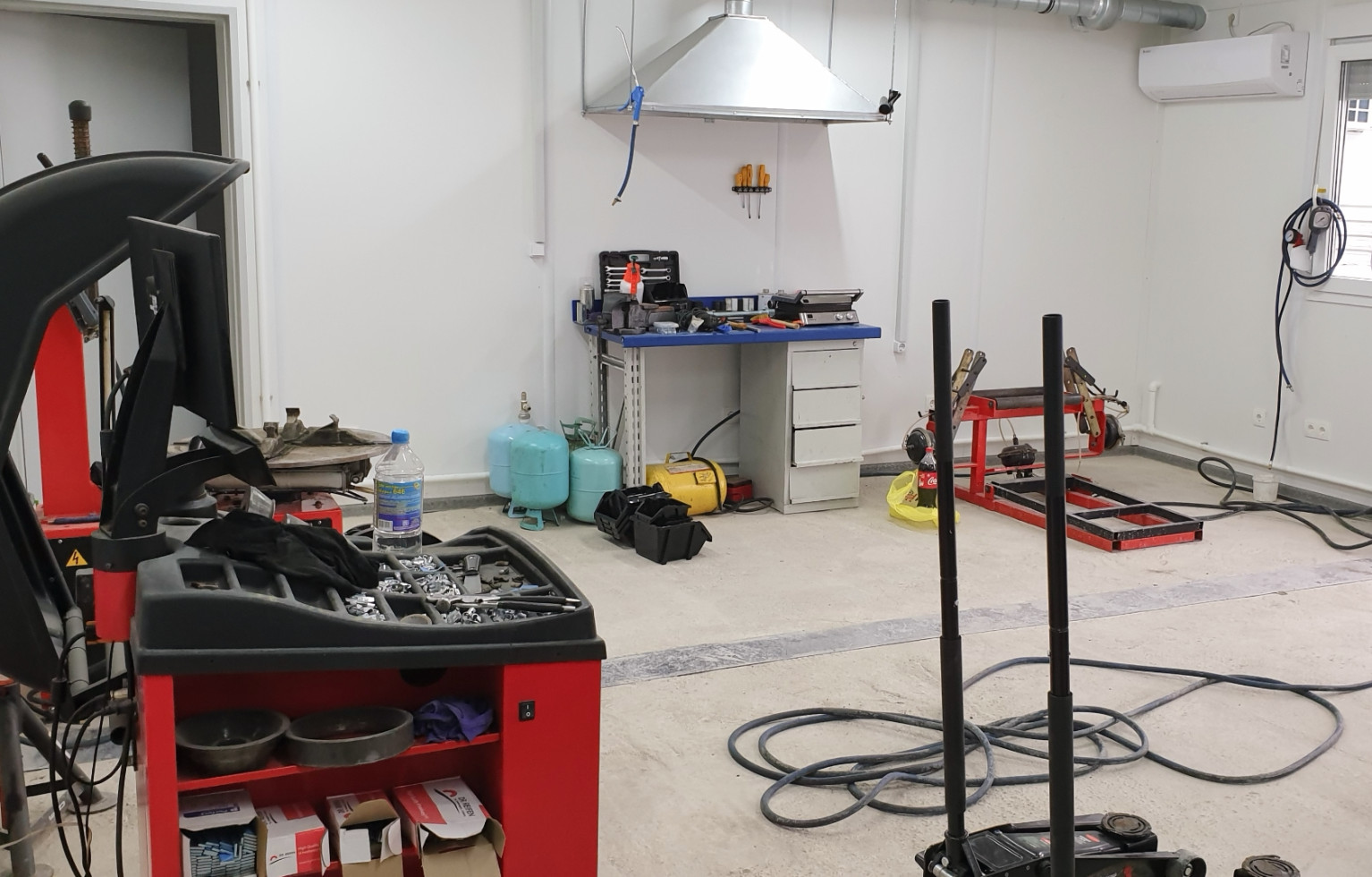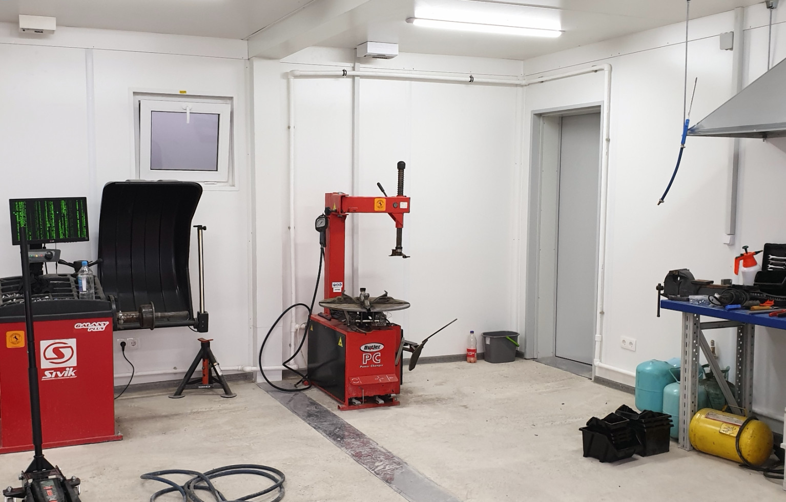 Шинный центр для обслуживания грузовых автомобилей, выполненный из пяти блок-контейнеров с устройством монолитного пола в ремонтной зоне.