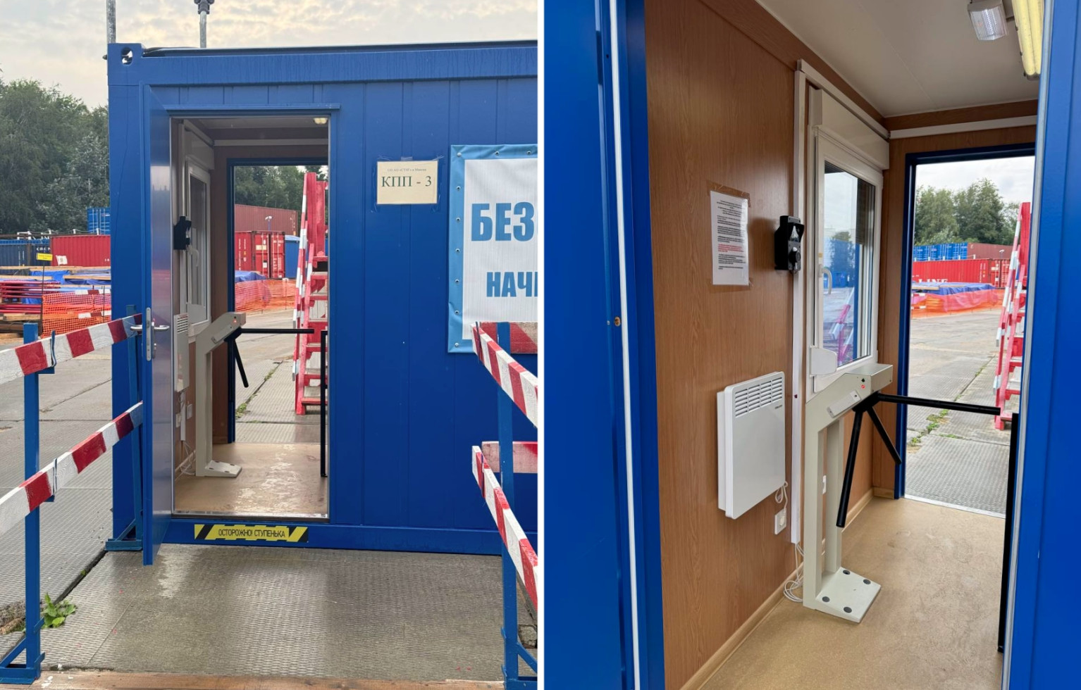 Блок-контейнер функционирующий в качестве контрольно-пропускного пункта и оснащён шлагбаумом для организации въезда на территорию шиномонтажного предприятия.