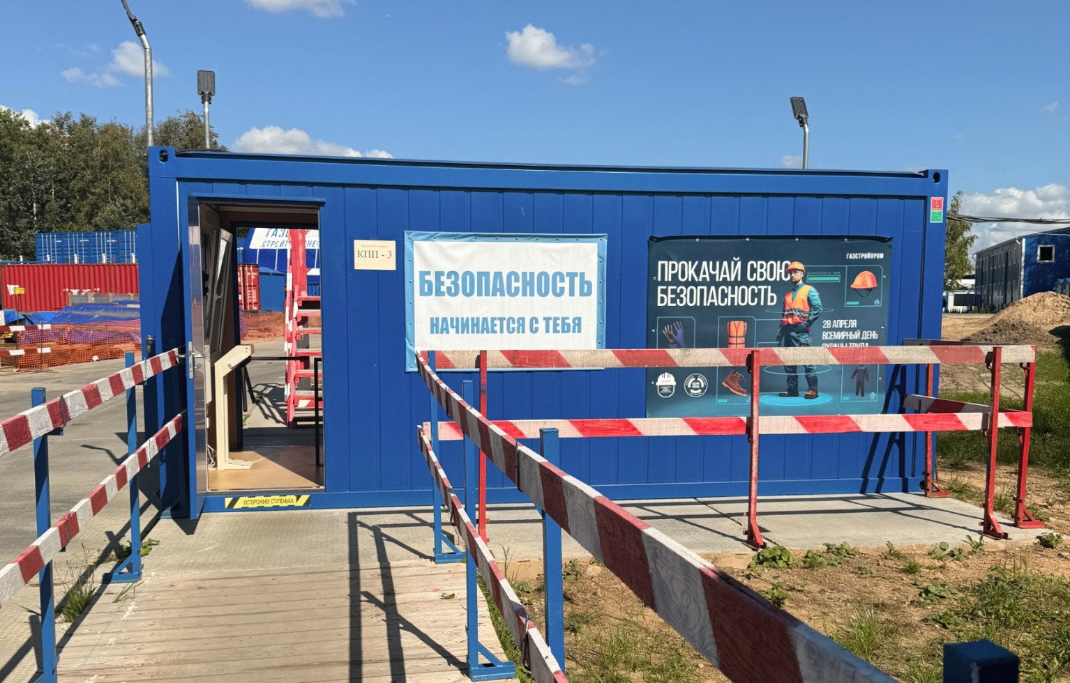 Санитарные модули и контрольно-пропускной пункт на строительном объекте, выполненные из семи блок-контейнеров.