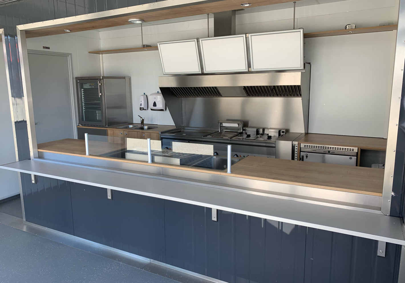 Модуль для кафе из контейнера от Контейнекс полностью изолирован от внешней среды, обеспечен системой приточно-вытяжной вентиляции, оборудован санитарным узлом, электроснабжением и внутренней отделкой, выполненной из гладких, легко очищаемых, влагостойких и не впитывающих запахи материалов, разрешённых для пищевых блоков.