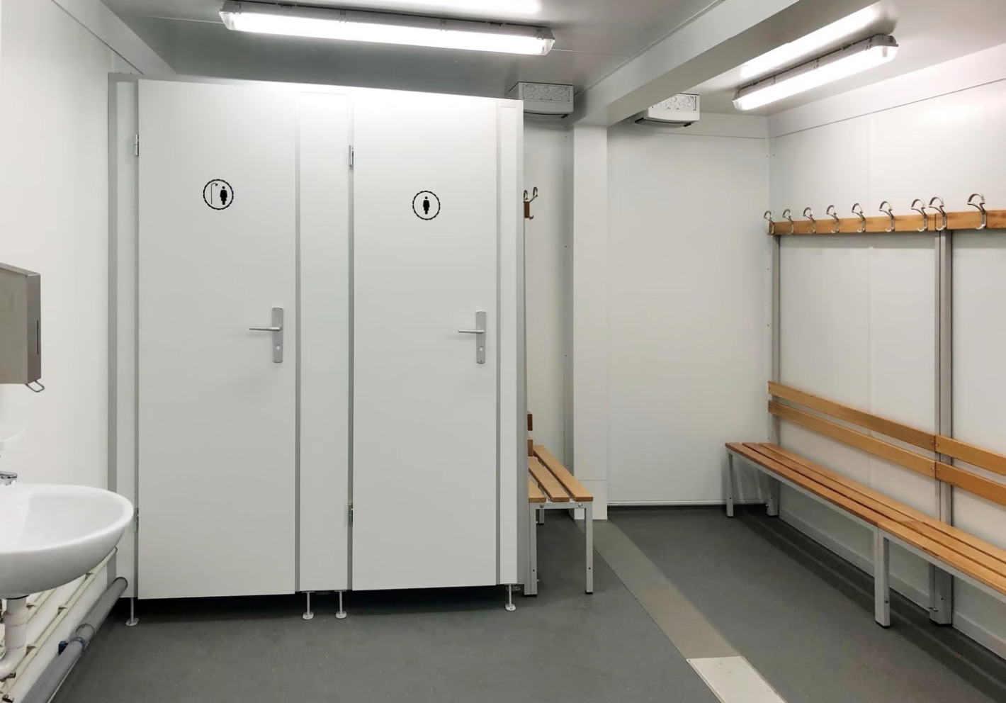 - Модульное здание раздевалка — универсальный формат для размещения раздевалок, душевых и туалетов в едином корпусе, особенно удобно для раздевалок для персонала на постоянных объектах.