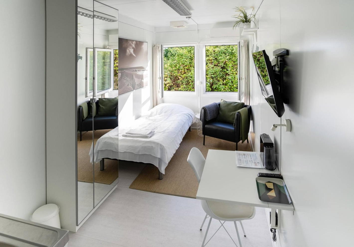 Гостиница из контейнеров ничем не уступает традиционным зданиям — внутри располагаются спальня, санузел, душ, система вентиляции и отопления. Возможна внутренняя и внешняя отделка в нужном стиле, а также брендирование фасада. Такие решения выбирают для размещения рабочих, временного персонала, туристов и корпоративных гостей.